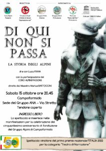 Il Gruppo Alpini di Campoformido compie mezzo secolo di vita. E per ricordare quell’ormai lontano anno della fondazione, era il 1972, sono state messe in calendario varie iniziative e manifestazioni. Una di queste, molto invitante, è in programma proprio oggi, quando alle 20.45, nel tendone coperto allestito dalla sede Ana in via Stretta, sarà presentato lo spettacolo “Di qui non si passa – La storia degli alpini”, di e con Luca Piana, con la partecipazione del Coro Alpini Passons diretto dal maestro Marius Bartoccini. Lo spettacolo ha vinto il primo premio nazionale Fitalia 2022 per la categoria “Teatro di Narrazione” ed è stato prodotto dal Circolo di studi artistici & sociali “Espressione est”. Beneficia dei patrocini dei Gruppi Ana di Branco e Primulacco, e della Pro Loco “Festa dei fiori” della stessa frazione di Povoletto, oltre che della collaborazione del Club per l’Unesco di Udine presieduto da Renata Capria D’Aronco.