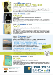Sabato 5 novembre alle 17, come detto, al Ridotto del Teatro Pasolini, la presentazione e visione dei corti documentari “I segreti del Tagliamento” di Cristina Noacco e “Lentamente verso il mare” di Fabrizio Zanfagnini. Entrambi gli autori saranno presenti alla serata ad ingresso gratuito. “I segreti del Tagliamento” è un resoconto dell’avventura di Alba che, in bicicletta, ha percorso oltre 170 km per raggiungere la sorgente del più importante bacino fluviale del Friuli. In “Lentamente verso mare” si racconta, invece, del viaggio del fiume Stella che dalle risorgive sfocia nella laguna di Marano. A seguire si terrà una proiezione di immagini fotografiche sul paesaggio a cura del Circolo Fotografico F64 di Casarsa.