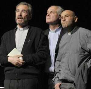 In copertina, una rappresentazione a Ciconicco di alcuni anni fa e qui sopra Claudio Moretti e Fabiano Fantini (con Elvio Scruzzi) in una foto di Luca d’Agostino mentre recitano “Predis”.