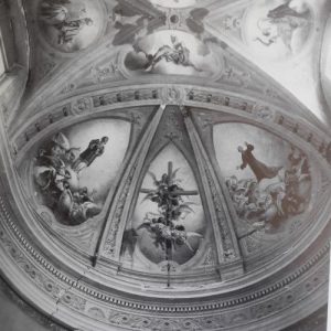 In copertina, gli affreschi di Tita Gori sopra il maestoso altare del Meyring (oggi in Duomo) nella Chiesa di Santo Stefano in Centa e all’interno un primo piano degli stessi che rappresentano soltanto una piccola parte del grandioso ciclo pittorico distrutto (fotografie storiche di Bruno Fabretti).