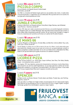 «Saranno cinque i film in programma tra luglio ed agosto – fa sapere Antonio Tesolin, presidente della Pro Loco –. Dopo il successo della Sagra del Vino che ci ha rivisti insieme trascorrere momenti di socialità e spensieratezza, ecco un’altra proposta per vivere l’estate all’insegna dello svago. Ringraziamo ancora una volta i nostri volontari del gruppo cinema che con grande entusiasmo hanno voluto aiutarci nell’organizzazione di queste serate: a loro il nostro plauso per il lavoro che faranno e che hanno fatto in questi anni».