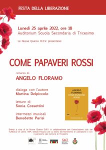 (g.l.) Per domani, a corollario delle manifestazioni del 25 Aprile, Festa della Liberazione, Le Nuove Querce di Tricesimo hanno organizzato un importante evento culturale-letterario. Alle 18, nell’auditorium della scuola secondaria, sarà infatti presentato il libro “Come papaveri rossi” (Edizioni Bee), romanzo del sandanielese Angelo Floramo, con il quale dialogherà Martina Delpiccolo. Sono previste anche letture di Sonia Cossettini, oltre a intermezzi musicali di Benedetto Parisi. L’iniziativa beneficia del patrocinio del Comune di Tricesimo e della collaborazione del Club per l’Unesco di Udine, dell’Anpi e dell’Istituto friulano per la storia del Movimento di Liberazione.