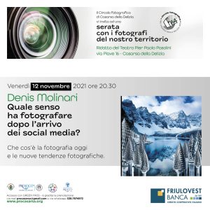 Il percorso attraverso i fotografi del territorio proseguirà, poi, venerdì 19 novembre assieme a Vittorio Battellini che tratterà il tema “La poesia della luce – La ricerca continua e l’uso della luce nel percorso professionale e creativo”. Quindi, il ciclo di incontri si concluderà venerdì 26 novembre con Elio Ciol che tratterà il tema “La fotografia alla ricerca dell’assoluto – Ricerca della dimensione spirituale e della perfezione tecnica e compositiva”.