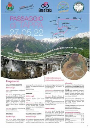 In copertina, il Santuario di Castelmonte illuminato dalla luce rosa e qui sopra il bel manifesto preparato a Lusevera per il passaggio del Giro a Villanova delle Grotte.