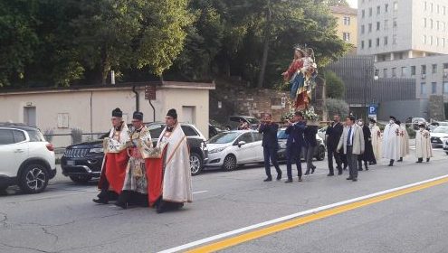 La festa patronale, indetta a 450 anni dalla Vittoria della Battaglia di Lepanto, era cominciata sabato 2 ottobre con il canto dei Primi Vesperi, mentre il giorno successivo è stata celebrata la messa solenne da don Valentino Viganò, accompagnata da un ricco programma musicale con opere di Schubert, Mozart e Heinichen. Di quest’ultimo, quale inno di ringraziamento, è stato eseguito il Te Deum. Nel tardo pomeriggio si è snodata la solenne processione, con la statua della Madonna, per le vie del centro storico: nell’occasione sono state eseguite musiche di Biber, Schütz e Frescobaldi. Il tutto, come al mattino, sotto la direzione del maestro Elia Macrì, protagonisti coro, solisti e orchestra della Cappella musicale “Beata Vergine del Rosario”, aderente all’Usci Fvg (soprani Daniela Esposito, Adriana Tomisic, Teodora Tommasi; contralto Fabiana Polli; tenori Peter Gus e Stefano Speranzon; basso Federico Aloisio). Al termine, la statua mariana è stata sistemata sull’altare maggiore dove rimane ancora alla venerazione dei fedeli che sempre numerosi frequentano la storica Chiesa, la quale è anche Cappella Civica di Trieste e punto di riferimento della Casa d’Austria che per secoli ha governato la città.