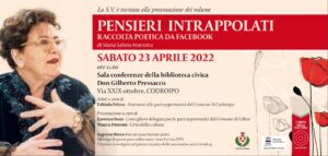 (g.l.) E ora i “Pensieri intrappolati” di Maria Sabina Marzotta approdano anche a Codroipo. La raccolta poetica di interventi quotidiani, o quasi, su Facebook, già presentata con successo due volte a Udine, sarà infatti protagonista nell’incontro che si terrà stamane, alle 11, nella sala conferenze della biblioteca civica “Don Gilberto Pressacco” in via XXIX Ottobre. Il libro dell’appassionata presidente del Caffè Letterario Udinese sarà presentato da Lorenza Ioan, consigliere delegata per le Pari opportunità del Comune di Udine, e da Maura Pontoni, della casa editrice L’Orto della Cultura di Pasian di Prato. Il tutto dopo un saluto di Fabiola Frizza, assessore alle Pari opportunità del Comune di Codroipo.