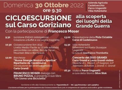 Come già annunciato, ci sarà infatti una Cicloescursione sul Carso Goriziano alla scoperta dei luoghi della Grande Guerra, con la straordinaria partecipazione del mitico Francesco Moser. L’appuntamento è alle 9.30 nella sede dell’azienda agricola Castelvecchio, nei cui pressi c’è anche il citato Parco Ungaretti. Alle 10.30 via al giro in bici di circa 16 chilometri su strada asfaltata. Al termine, nella barchessa di Castelvecchio che, due settimane fa, aveva ospitato il concerto inaugurale del Festival Schippers autunnale, il direttore artistico Carlo Grandi illustrerà il senso di questa bella iniziativa, lasciando poi lo spazio al grande campione, il quale, dialogando con il giornalista Bruno Pizzul, presenterà il suo libro “Un Uomo una Bicicletta”. Alle 13 è annunciata la inaugurazione della Pista ciclabile Carso di Castelnuovo. Quindi, nel pomeriggio, alle 15.30, a Villa Hohenlohe, che nel 1869 ospitò Franz Liszt, ci saranno le riflessioni di Gianfranco Trombetta proprio su Giuseppe Ungaretti, mentre il Duo Grandi – formato dai violinisti Carlo e Laura Grandi – proporrà brani di Mozart, Guignon, Telemann, Bartòk e degli stessi concertisti. Infine, la ricca giornata carsolina sarà coronata da una visita guidata al citato Parco Ungaretti condotta dallo storico Silvo Stok.