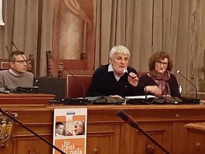 UDINE – Sono state le coinvolgenti note della quinta Danza ungherese di Johannes Brahms, interpretata dalle fisarmoniche di Manuel e Pasqualino Petris, a concludere, a palazzo Belgrado già sede della storica Provincia di Udine, la presentazione di “Jo i soi di paîs”, il bellissimo libro, prima fatica letteraria, di Dino Persello, nel quale l’attore sandanielese, ma originario della vicina Dignano, ha scritto “Frammenti di vita vissuta, tra… impegno, profilo civico, passioni, ironia, autoironia”. Il volume, uscito con i tipi di Litoimmagine, ha beneficiato del patrocinio del Consiglio regionale del Friuli Venezia Giulia – nella cui sede Persello era intervenuto, molto applaudito, in occasione dell’ultima “Fieste de Patrie dal Friûl” – e del sostegno di Generali Centro Friuli e di Bcc Credifriuli.