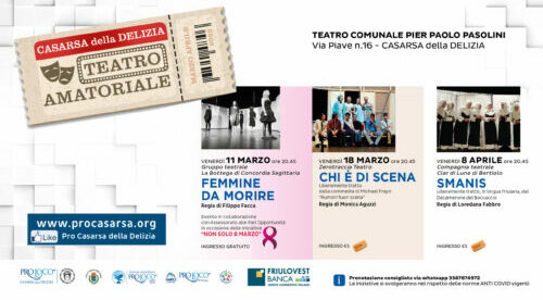Ora che l’emergenza sanitaria pare che abbia finalmente allentato la presa, al Pasolini di Casarsa della Delizia riparte il teatro amatoriale con tre spettacoli in programma tra marzo ed aprile per la rassegna “Teatro – Luogo del Pensiero” organizzata dalla Pro Loco in collaborazione con l’amministrazione comunale. «Dopo lo stop causato dalla pandemia siamo lieti di poter proseguire, oltre che col cinema anche con la rassegna di teatro amatoriale – ha affermato il presidente della Pro Casarsa, Antonio Tesolin – che rappresenta un fiore all’occhiello delle nostre proposte. Cerchiamo di selezionare il meglio della produzione delle compagnie locali per divertire, ma anche per far riflettere il pubblico che dimostra sempre di apprezzare il nostro calendario; in più vi sarà anche un evento gratuito dedicato al tema della violenza contro le donne a cui invitiamo tutti a partecipare e a chiudere uno spettacolo in lingua friulana».