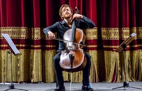 In copertina, Michele Marco Rossi in un curioso atteggiamento con il suo violoncello e qui sopra in concerto.