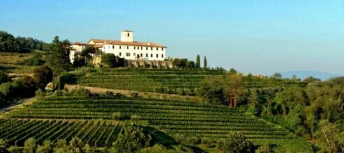 In copertina, il giornalista e scrittore triestino Furio Baldassi e qui sopra un’immagine dell’Abbazia di Rosazzo tra i vigneti colta dall’obiettivo di Luigi Vitale.