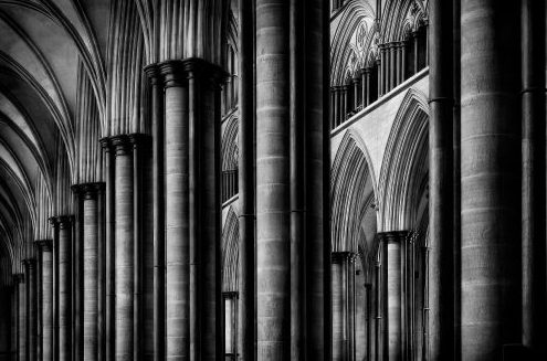 «Le inquadrature “oblique” di Indrigo – spiega il curatore Giancarlo Pauletto – sembrano voler intensificare il senso di meraviglia e quasi di vertigine che lo sguardo, nel suo errare tra pareti e pilastri, volte e crociere, sperimenta, con ciò entrando in contatto con un “sacro”, che è quello infinito della divinità e che dunque è “vertiginoso” per natura. Penso qui alla Cattedrale dei Santi San Gervasio e Protasio a Soissons, in Francia, alle alte crociere prese d’infilata a Salisbury e a Wells, alla Cattedrale di Notre Dame ad Amiens, dove è la presenza inaspettata delle due figure-cariatidi sulla destra ad impersonare, per lo spettatore, la presenza e la curiosità umana di chi entra ed esplora l’aria grandiosa della costruzione». Ci sono poi le “fotografie-gioiello, fotografie-scrigno, fotografie in cui si staglia una preziosità che carica gli spazi di un’intensa aura mistica”. Come per il luminoso spazio dell’organo nella Cattedrale di Wells, la raggiera di archi e colonne che si alzano fino alla volta nella cattedrale di Beauvais, il grande lampadario che pende dalla volta a Soissons, incastonato nel gioco della luce. Ma l’obiettivo inquadra anche il gioco dei pilastri, a Salisbury, o riferisce in maniera perfettamente ortogonale sulla navata centrale di Senlis. o ancora inquadra, ad Amiens, la predicazione del Battista o il battesimo di Cristo.