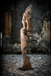 Un’artista sicuramente singolare, Arianna Gasperina, a partire dall’utilizzo della motosega che muove intorno al blocco di legno con un’eleganza inaspettata: «Vederla mentre si alza, si abbassa con l’imponente strumento metallico è come assistere ad una danza sul posto, tanta è l’innata leggerezza, o meglio, naturalezza esibita – aggiunge Lorena Gava -. Riconoscibilissima è sempre la tensione verso l’alto, quel suo lavorare la materia per realizzare figure che ambiscono a liberarsi dai lacci della materia per assurgere a vita nuova, per conquistare una dimensione “altra”. Il succedersi di parti concave e convesse, di pieni e di vuoti, di zone sovraesposte e altre incavate, documenta una prassi scultorea attenta e nello stesso tempo una logica compositiva dinamica e fortemente espressiva».