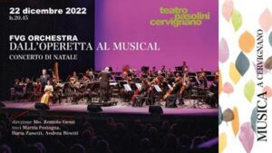“Dall’Operetta al Musical” questa sera a Cervignano. Alle ore 20.45, nel cartellone della Stagione Musica 2022_2023 del Teatro Pasolini, curata da Euritmica, si terrà infatti il tradizionale Concerto di Natale che avrà per protagonista la Fvg Orchestra diretta da Romolo Gessi con le voci di Andrea Binetti, Ilaria Zanetti e Marzia Postogna.