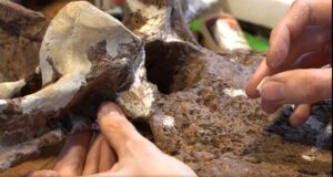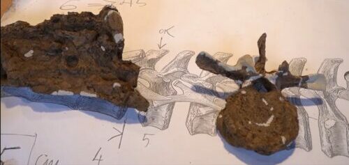 A breve sarà anche preparata la sezione di un osso particolarmente lungo per procedere ad un’analisi che permetta di risalire all’età di Big John: questo aiuterà ancora meglio a capire se la natura, le dimensioni, la morfologia generale del gigantesco animale sono sue peculiarità o magari queste caratteristiche sono dovute al fatto che era un esemplare molto vecchio, come alcuni elementi farebbero supporre. Interessante dettaglio emerso in questi giorni è il rinvenimento durante la preparazione di un blocco di vertebre di un dente di dinosauro carnivoro: un reperto parziale, ma indubbiamente interessante. Non era piantato sulle ossa di Big John, ma testimonia senza dubbio la presenza di predatori nell’area frequentata dal triceratopo.