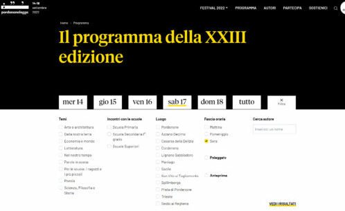Il nuovo sito pordenonelegge.it si presenterà con un importante restyling grafico, che vuole conferire una innovativa identità visiva. Avrà uno stile minimale e moderno, e naturalmente conserverà i colori caratterizzanti e identificanti il festival: il giallo, che incarna la storia pluridecennale del brand, per dare visibilità a pulsanti e icone, e il nero preposto a bilanciarne la brillantezza, donando eleganza al layout. Il bianco scelto per lo sfondo garantirà più spazio possibile al contenuto, senza sopraffarlo. Uno spazio di rilievo sarà riservato all’immagine di quest’edizione di Pordenonelegge: la spiga di grano è la protagonista della fascia principale nell’homepage. Ovviamente grande importanza è stata data al “mobile first”, in modo da garantire un’esperienza utente positiva e intuitiva da smartphone, tablet e desktop.
