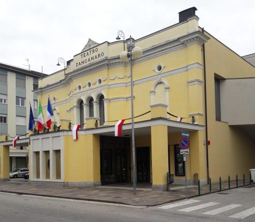 In copertina il centro storico di Sacile e qui il Teatro Zancanaro che ospiterà la finalissima di Piano Fvg.