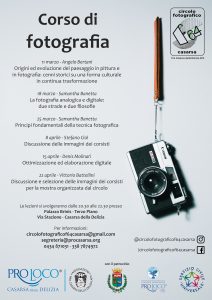 Come detto, a marzo partirà il corso di fotografia. Si tratta di sei lezioni in cui si tratteranno diversi argomenti: a partire dalla storia della fotografia fino ad arrivare all’elaborazione digitale delle immagini. Alla fine del corso, saranno selezionate alcune immagini dei corsisti per una mostra dei lavori. Il ciclo di lezioni partirà l’11 marzo con Angelo Bertani che parlerà di “Origini ed evoluzione del paesaggio in pittura e fotografia: cenni storici su una forma culturale in continua trasformazione”. Si proseguirà il 18 marzo con Samantha Banetta che tratterà il tema della fotografia analogica e digitale per proseguire, sempre lei, il 25 marzo con “Principi fondamentali della tecnica fotografica”. L’8 aprile sarà la volta di Stefano Ciol con la discussione delle immagini dei corsisti. Si prosegue il 15 aprile con Denis Molinari che introdurrà i corsisti al tema dell’”Ottimizzazione ed elaborazione digitale”. A chiudere le lezioni sarà Vittorio Battellini con la discussione e selezione delle immagini dei corsisti per la mostra organizzata dal circolo. Le lezioni si svolgeranno dalle 20.30 alle 22.30 a Palazzo Brinis a Casarsa. Il corso è organizzato con il sostegno della Pro Casarsa e il patrocinio della Città di Casarsa della Delizia, Unpli nazionale e Servizio Civile Universale.
