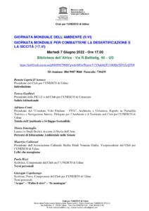 Appuntamento oggi in occasione delle Giornate mondiali dell’ambiente e contro la desertificazione e la siccità. L’incontro, che potrà essere seguito anche online (nella locandina che segue ci sono gli estremi), si terrà alle 17 nella Biblioteca dell’Africa, in via Battistig 48. Diverse e interessanti le relazioni dopo l’intervento introduttivo di Renata Capria D’Aronco, presidente del Club per l’Unesco di Udine.