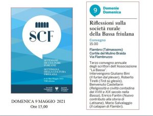 Nell’ambito della “Setemane de culture furlane”, a cura della Società Filologica Friulana, oggi 9 maggio, a Flambro, nel cortile del Mulino Braida, con inizio alle 15, si terrà il Terzo Convegno degli scrittori dell’associazione “la bassa”. Il tema, “Riflessioni sulla società rurale della bassa friulana”, verrà proposto negli interventi delle migliori firme dell’ammirevole sodalizio culturale che, in quarant’anni di attività, ha prodotto una serie considerevole di pubblicazioni storiche, studi, catalogazioni sul territorio del Basso Friuli e del Portogruarese. Interverranno all’incontro: Giuliano Bini (“Il furlàn dal plevàn”), Roberto Tirelli (“Tirà sù glesiis”), Benvenuto Castellarin (“Religiosità e civiltà contadina del XVIII e XIX secolo nella Bassa”), Enrico Fantin (“Nuovo contributo alla storia di Latisana”), Mario Salvalaggio (“Il catapàn di Flambri”). Nello stesso ambito sono previsti gli incontri “Anatomie di une conte”, narrazione e scrittura creativa con Contecurte (anche domani in streaming ) e Populpop, laboratorio musicale con Michele Polo e Leo Virgili, online o in presenza nella sala multimediale della biblioteca Villa Dora a San Giorgio di Nogaro (14 maggio ) con la collaborazione del Comune di San Giorgio di Nogaro e del Sportèl furlàn de basse furlane.
