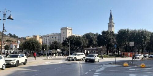 In copertina, uno scorcio di piazza della Repubblica con sullo sfondo la Rocca; qui sopra, ancora il centro di Monfalcone.