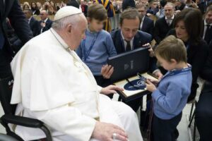 «È stato un grande onore incontrare Papa Francesco e donargli alcuni omaggi provenienti dal Friuli Venezia Giulia, tra cui un merletto realizzato dalla Scuola di Gorizia, a testimonianza delle profonde radici dell’arte nella nostra regione. Ora attendiamo il momento dell’accensione dell’albero di piazza San Pietro e del Presepe donato al Vaticano dal Comune di Sutrio, che proietterà la nostra regione al centro delle celebrazioni del Santo Natale nel cuore pulsante della cristianità fino all’Epifania», ha detto Massimiliano Fedriga, al termine dell’udienza del Santo Padre avvenuta ieri mattina, durante la quale sono stati donati dalla delegazione del Friuli Venezia Giulia alcuni oggetti particolarmente rappresentativi della nostra regione tra i quali anche, oltre al merletto, un paio di “scarpez”, la calzatura tipica tradizionale della Carnia e del Friuli fatta a mano, e un Cristo ligneo intagliato da Isaia Moro, uno degli artisti che ha realizzato il grande presepe di Sutrio. «Incontrare il Santo Padre è sempre una grande emozione e fa molto piacere che Papa Francesco abbia citato nel proprio intervento il nostro territorio e in particolare la località di Sutrio, che ha realizzato il meraviglioso presepe ora collocato in piazza San Pietro», ha aggiunto Fedriga.