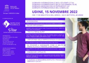 Alle 17, invece, nella sede della Biblioteca dell’Africa, in via Romeo Battistig 48 (ma anche da remoto con le coordinate che riportiamo nella locandina), fari puntati sulla Giornata internazionale degli studenti, sulla Giornata internazionale della tolleranza, sulla Giornata mondiale della filosofia (Unesco) e sulla Giornata internazionale dell’uomo. I lavori saranno aperti da Renata Capria D’Aronco, presidente del Club per l’Unesco di Udine (che ha promosso e organizzato l’iniziativa); seguiranno gli interventi di Teresa Gualtieri, Giuseppe Capoluongo, Francesco Palazzolo, Stella Nosella, Angelo Bertolo e Gaia Confente.