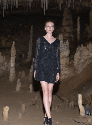 In vista della prestigiosa Settimana milanese della moda, vetrina di risalto internazionale in programma dal 23 al 26 settembre, il brand friulano Musté Studios di Mariana Musclot Stetco – selezionato per partecipare all’evento – ha scelto proprio l’affascinante ambiente sotterraneo delle Grotte di Villanova come cornice e sfondo per la presentazione della sua collezione. Di recente, così, durante la notte – per evitare sovrapposizioni con le presenze turistiche, fra l’altro sempre più copiose – un team di fotografi, videomaker e assistenti dotati di attrezzature fotografiche e di ripresa idonee al luogo hanno immortalato tra le stalattiti, le stalagmiti e i luccicanti cristalli della maestosa Sala Regina Margherita, della misteriosa Cripta Indiana e dello splendido Angolo dei Cristalli le top model Ophelia Kumbe, originaria del Mozambico ma da 20 anni residente in Italia (e già “Madre Natura” nella seguitissima trasmissione televisiva “Ciao Darwin”, condotta da Paolo Bonolis), ed Elena Egorova, russa, che hanno indossato capi di abbigliamento e accessori dell’ultima collezione dell’azienda sopra citata.