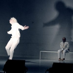 “Al Presente” è uno spaccato della mente e della sua inafferrabilità. In scena un uomo e il suo doppio: una parte è immobile, assorta, riflessiva, una parte è inquieta e si identifica con i fantasmi che popolano la sua mente. Entra attraverso l’immaginazione in un flusso di associazioni inarrestabili che lo conducono in diversi spazi, in diversi tempi della sua vita. Prende a prestito dalle patologie psichiatriche gli atteggiamenti fisici che esprimono tensioni, le amplifica attraverso quelle forme, porta alla luce le pulsioni più nascoste, cerca di dare ordine, forma, al caos della sua mente.