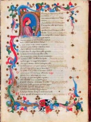 In copertina, un celeberrimo ritratto di Dante Alighieri con la Divina Commedia; qui sopra, il  codice miniato del 1466 comunemente denominato “Codice de Claricini” (foto tratta dal programma delle iniziative per il settimo centenario della morte di Sommo Poeta, a cura della Fondazione de Claricini Dornpacher di Bottenicco).