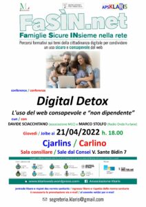 La prima delle conferenze in programma si tiene il prossimo 21 aprile a Carlino. L’appuntamento è per le 18 nella sala consiliare di via Sante Bidin 7, dove Davide Sciacchitano dell’associazione Mec, introdotto da Marco Stolfo di Radio Onde Furlane, parlerà di Digital Detox. L’uso del web consapevole e “non dipendente” soffermandosi sulla necessità di prendere coscienza del potere di coinvolgimento della rete e delle logiche di costruzione dei prodotti che inducono dipendenza e quindi di elaborare e praticare strategie di autocontrollo e di gestione del tempo on line. L’incontro è aperto a tutti e si rivolge in particolare ai genitori di bambini e ragazzi. La partecipazione all’incontro è libera e gratuita e nel rispetto delle norme sanitarie in vigore per gli eventi pubblici al chiuso e pertanto è necessario prenotarsi scrivendo all’indirizzo email: segreteria.klaris@gmail.com. Le altre cinque conferenze si terranno nelle settimane successive. Il primo di questi appuntamenti è fissato il 27 aprile a Orsaria di Premariacco.